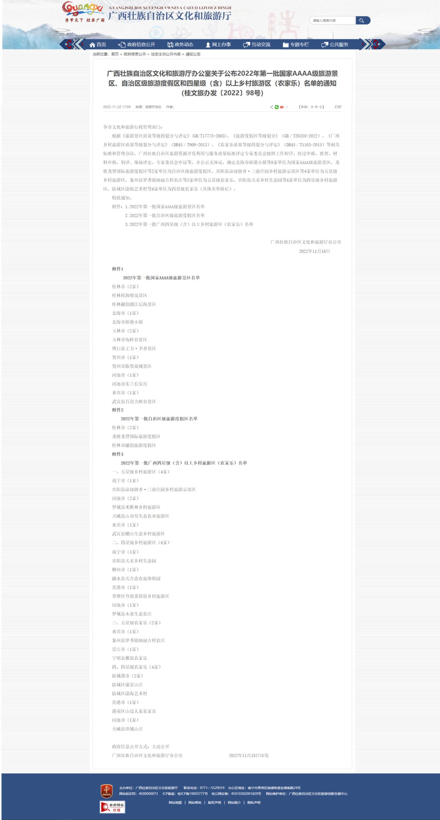 廣西壯族自治區(qū)文化和旅游廳辦公室關(guān)于公布2022年第一批國家AAAA級旅游景區(qū)、自治區(qū)級旅游度假區(qū)和四星級(含)以上鄉(xiāng)村旅游區(qū)(農(nóng)家樂)名單的通知 (桂文旅辦發(fā)〔2022〕98號)