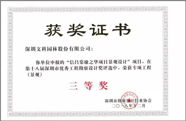 2018是棠棣之華的豐收年,繼在2018地產(chǎn)風(fēng)云榜榮獲6項(xiàng)大獎(jiǎng),躋身桂林樓市前三甲后,如今棠棣之華再次一舉斬獲第十八屆深圳市優(yōu)秀工程勘察設(shè)計(jì)獎(jiǎng)——專項(xiàng)工程(景觀)三等獎(jiǎng)。
