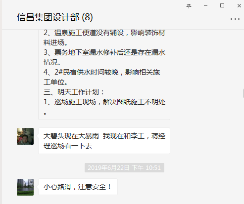 設(shè)計部工作的大碧頭的同事,更是不忘自己的使命為配合施工單盡快完工,確保質(zhì)量每天都巡視現(xiàn)場好幾遍,遇到晚上會有大暴雨天氣都要現(xiàn)場巡視一遍才能安心回宿舍休息。